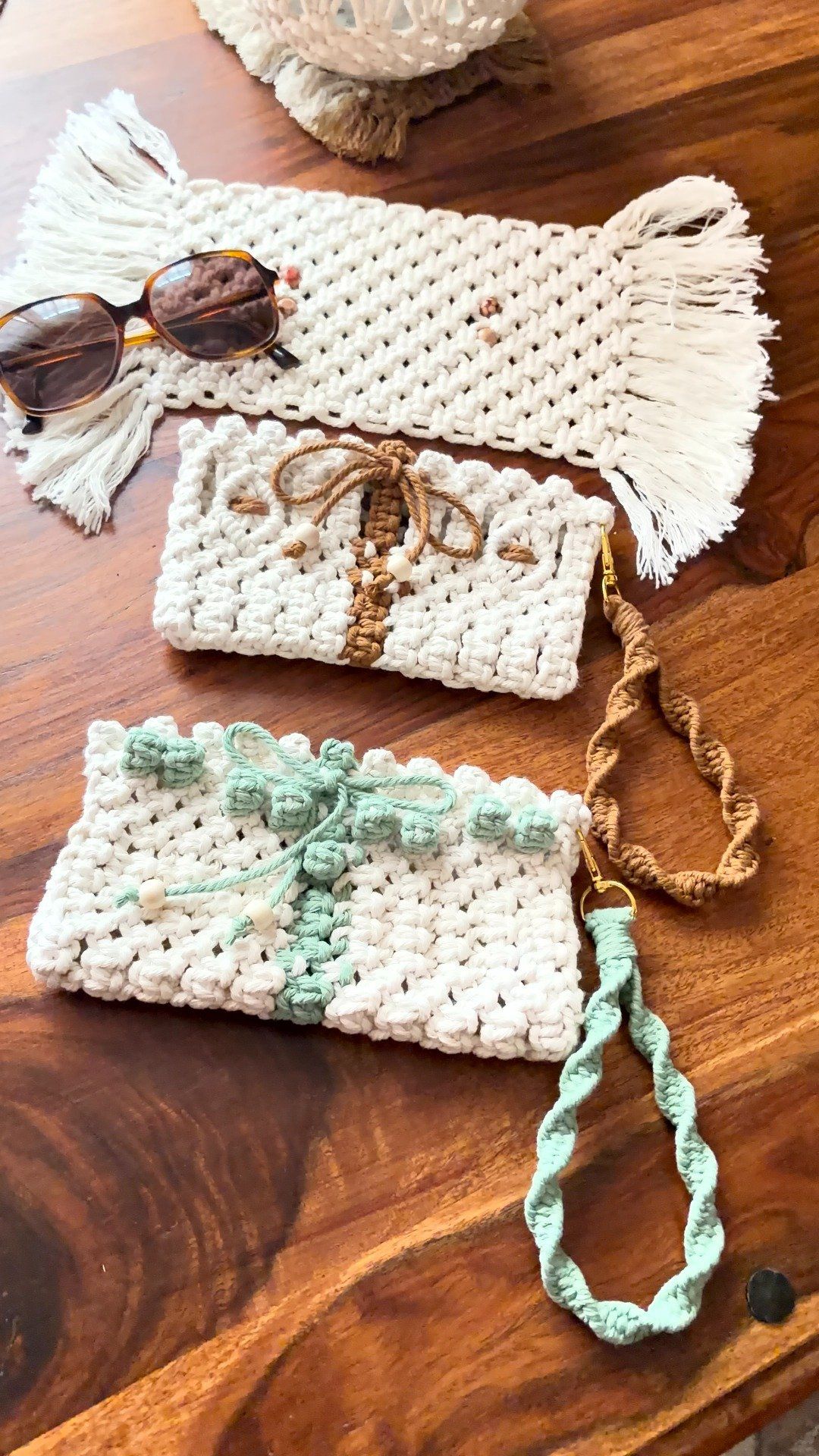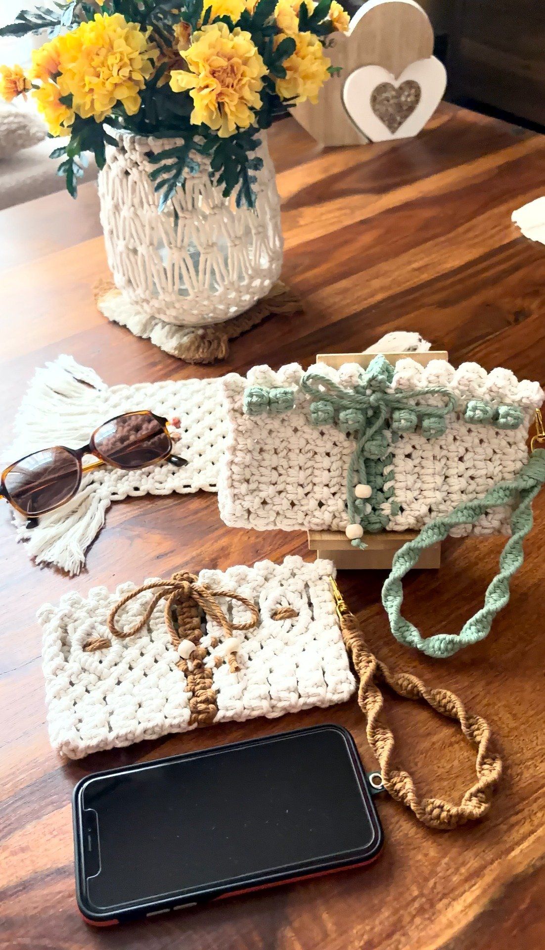 Pochette en macramé faite main, idéale pour votre téléphone, la pochette bohème qui vous suit partout grâce à son lien que vous pourrez porter à votre poignet.