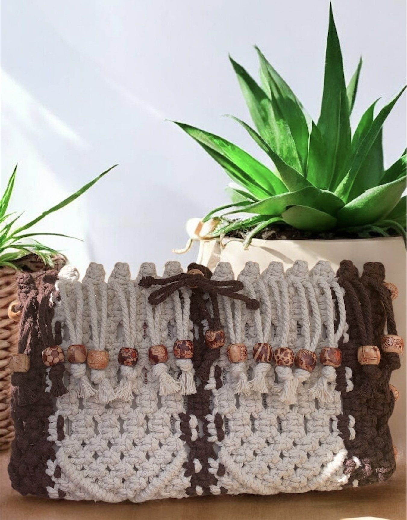 Son tissage raffiné est sublimé par des perles en bois multicolores et des finitions contrastées en marron, offrant une allure à la fois bohème et élégante.