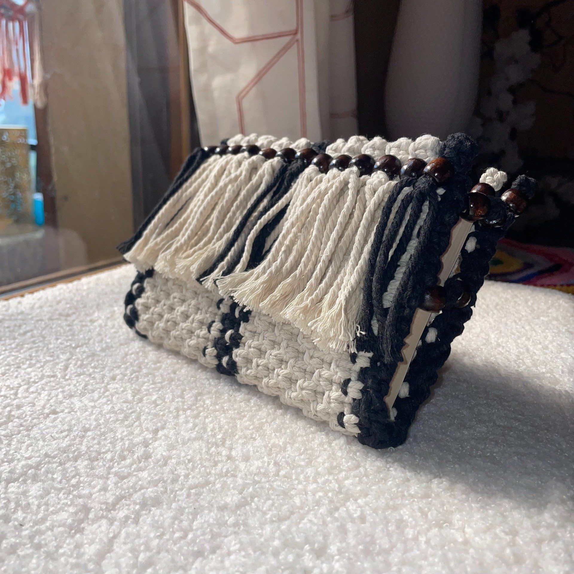 Coton naturel, beige, noir, perles en bois naturelles.