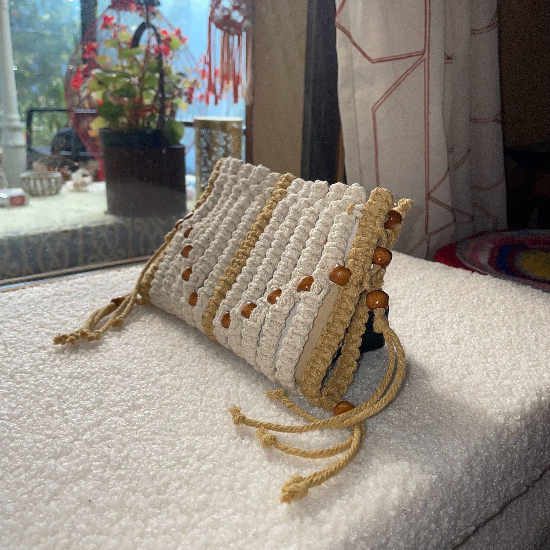 Son tissage raffiné est sublimé par des perles en bois qui apportent une touche naturelle, offrant une allure à la fois bohème et élégante.