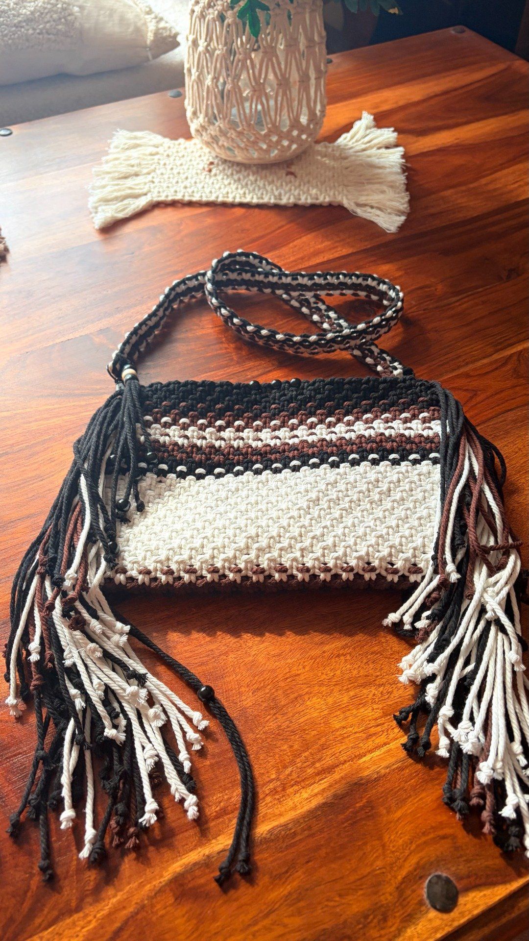 Réalisé avec soin à partir de cordes de coton, il associe des teintes naturelles, blanc, marron, noir et des perles naturelles en bois.