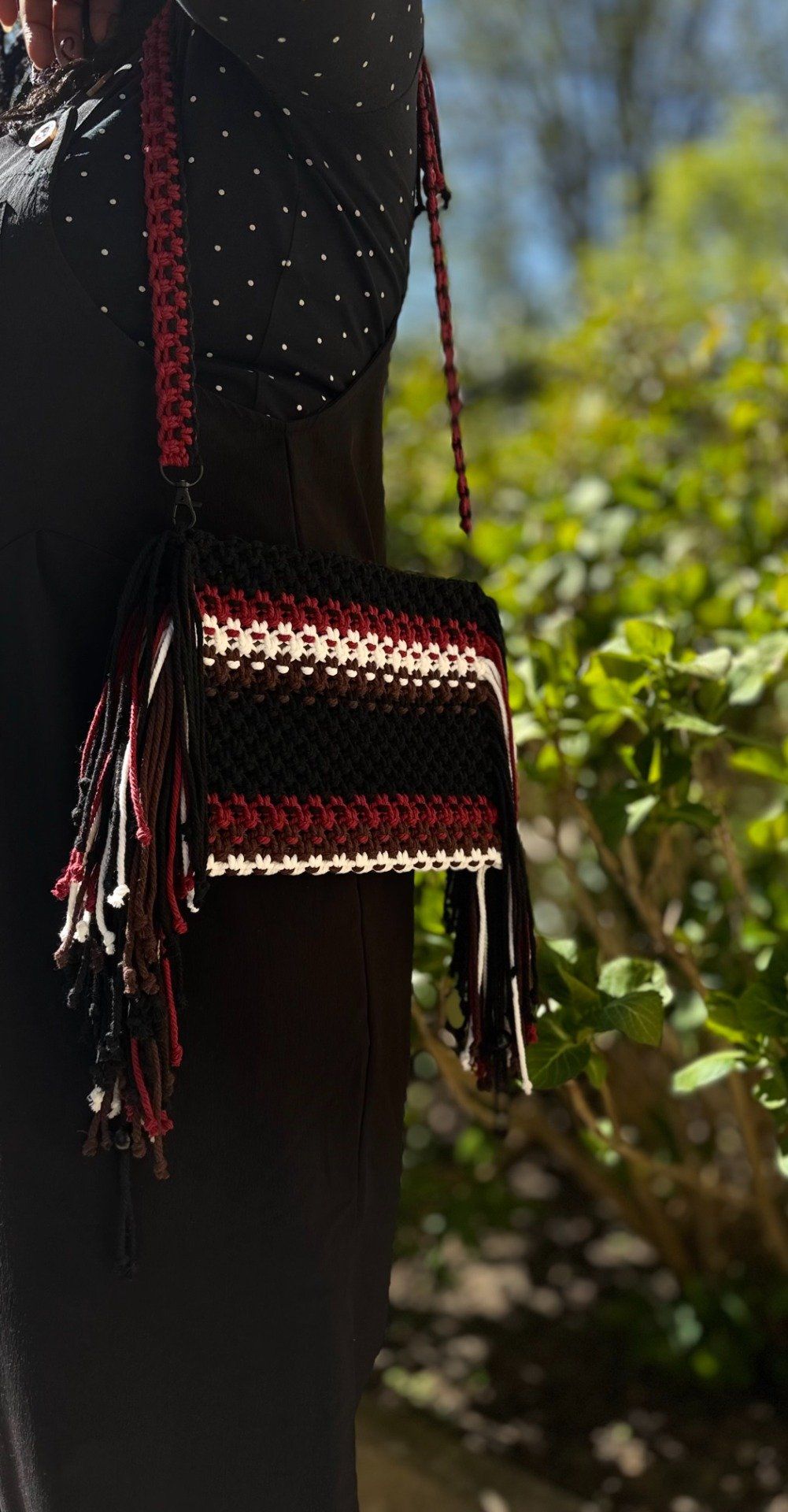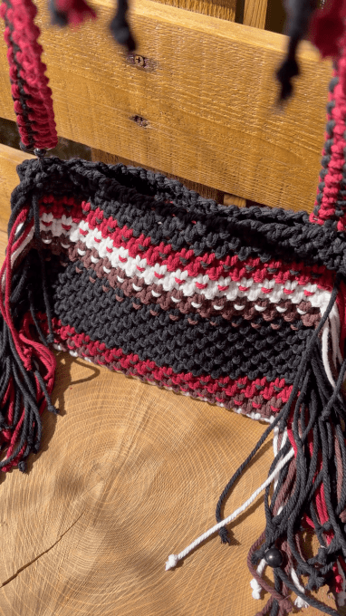Craquez pour ce sac en macramé fait main, une pièce artisanale unique signé Muze Créations. Ses nuances de noir, marron, blanc et vin rouge s’entrelacent harmonieusement pour créer un style bohème chic à la fois intense et élégant.