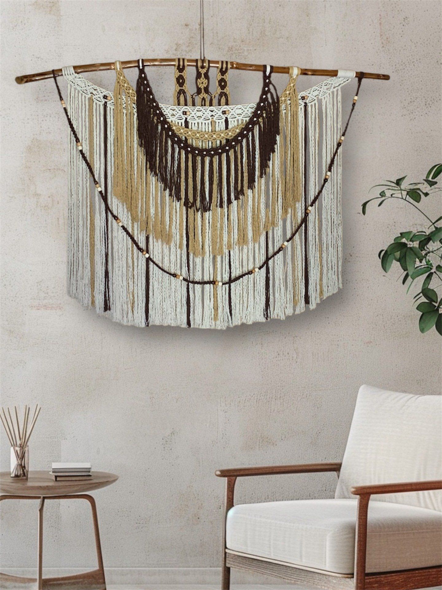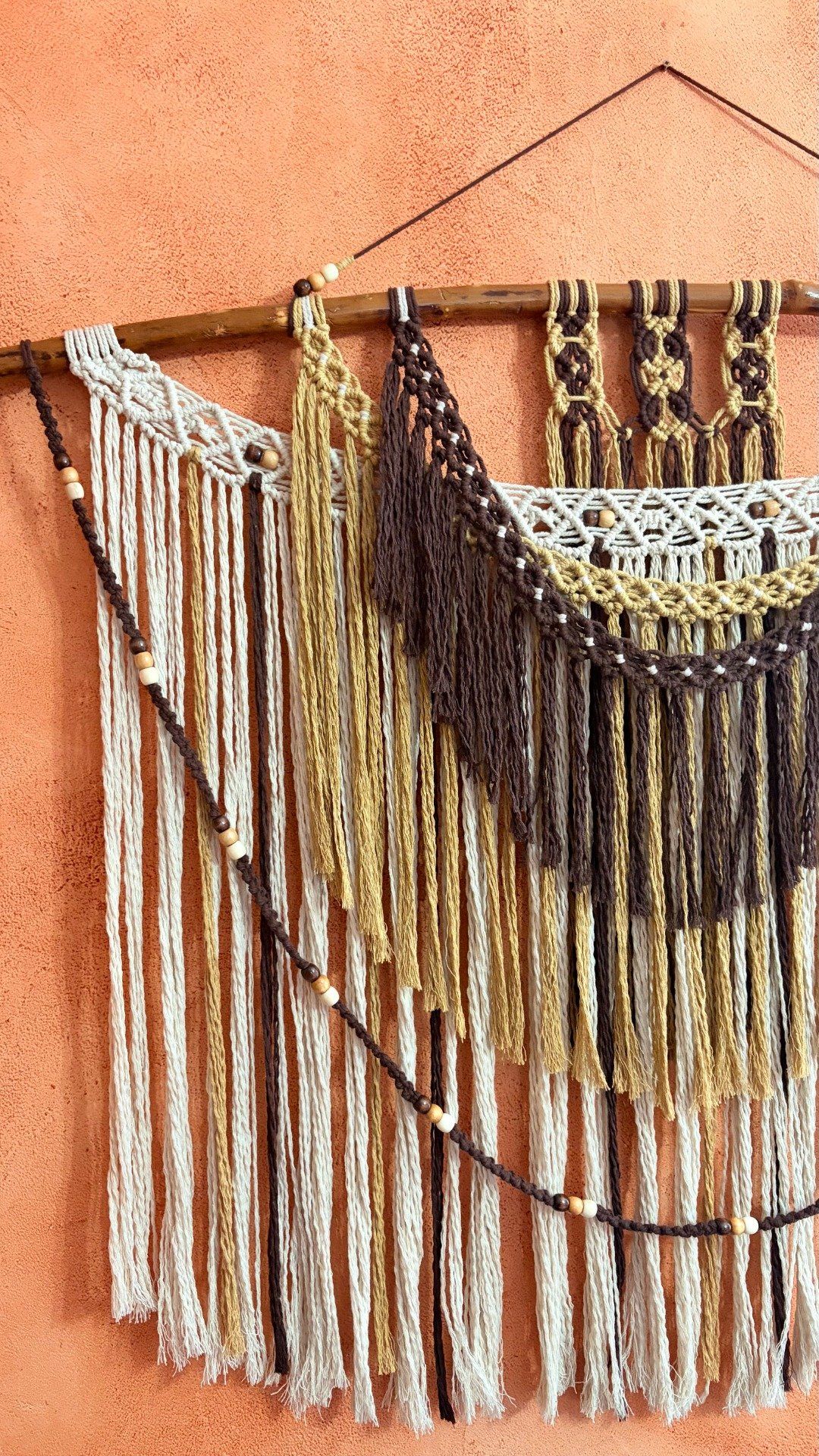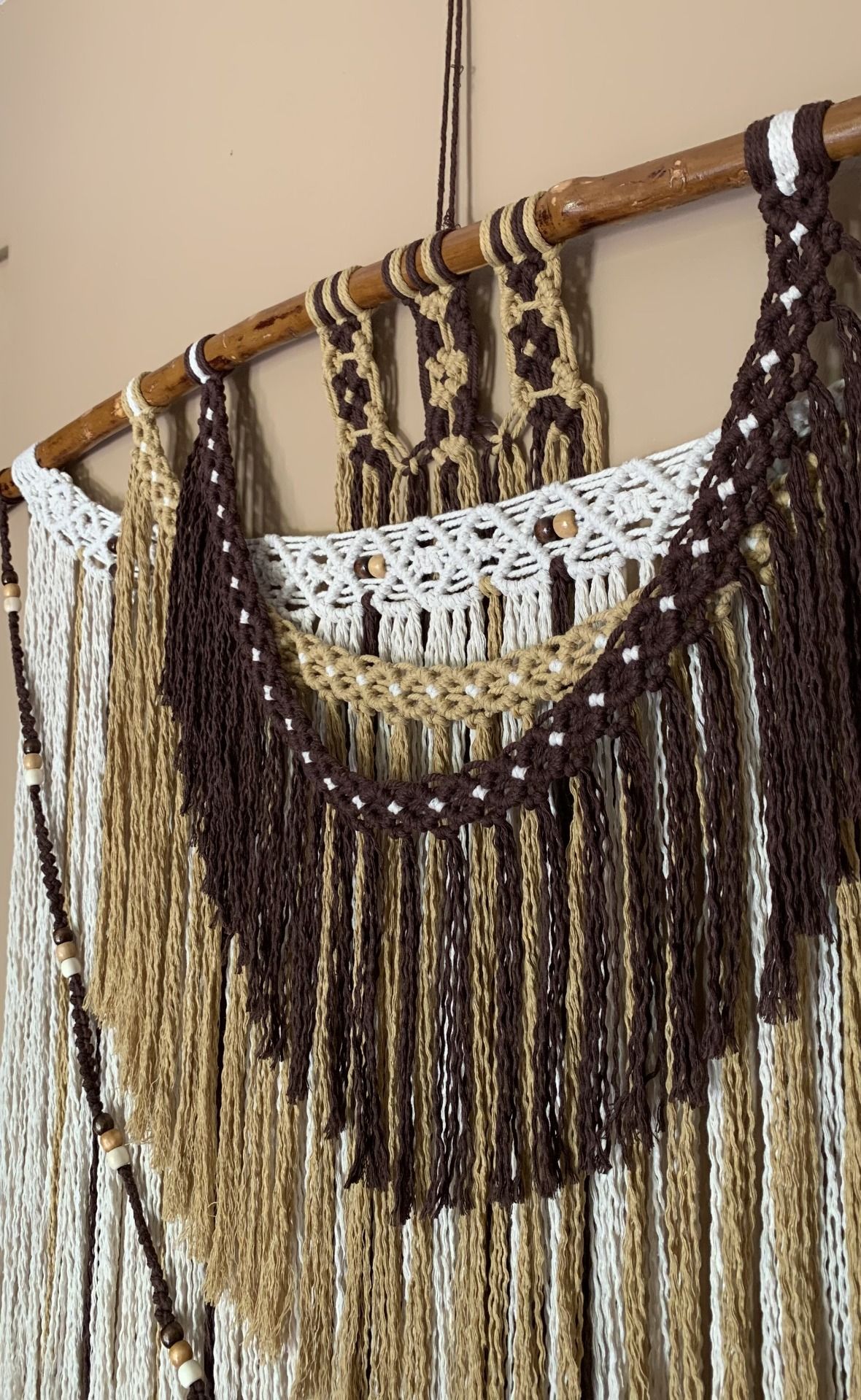 Tissée en coton beige, café et marron, elle marie des motifs géométriques délicats, des franges fluides et des perles en bois naturelles.